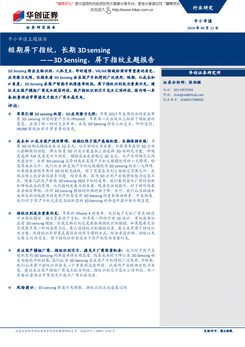 证监会审核华创证券投资咨询业务资格批文号:证监许可(2009)1210号 未经许可,禁止转载证券研究报告 中小市值主题报告短期屏下指纹,长期3D sensing ——3DSensing、屏下指纹主题报告3DSensing将在生物识别、人机交互、即时通信、VR/AR领域扮演非常重要的角色,应用潜力无限。
