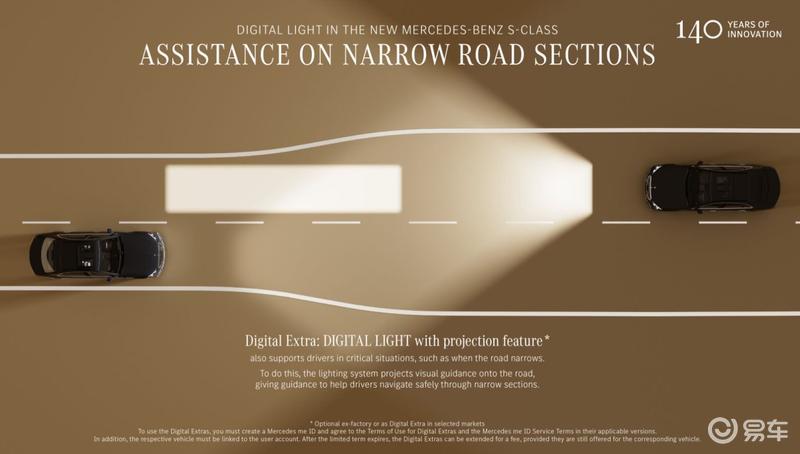 依托MB.OS架构,ULTRA RANGE超远距照明功能不仅实现长达600米的照射距离,更具备弯道照明和局部远光功能,可随弯道主动调整照射方向,在光线不足的情况下,有效提升对其他道路使用者的识别能力;同时其局部远光遮蔽功能进一步升级,可更精准地识别昏暗光线中其他道路使用者并进行动态屏蔽,既能照清前路,又不造成眩目。此外,其新增低温预警投影功能,可在路面投射雪花标识,为驾驶者提供警示。