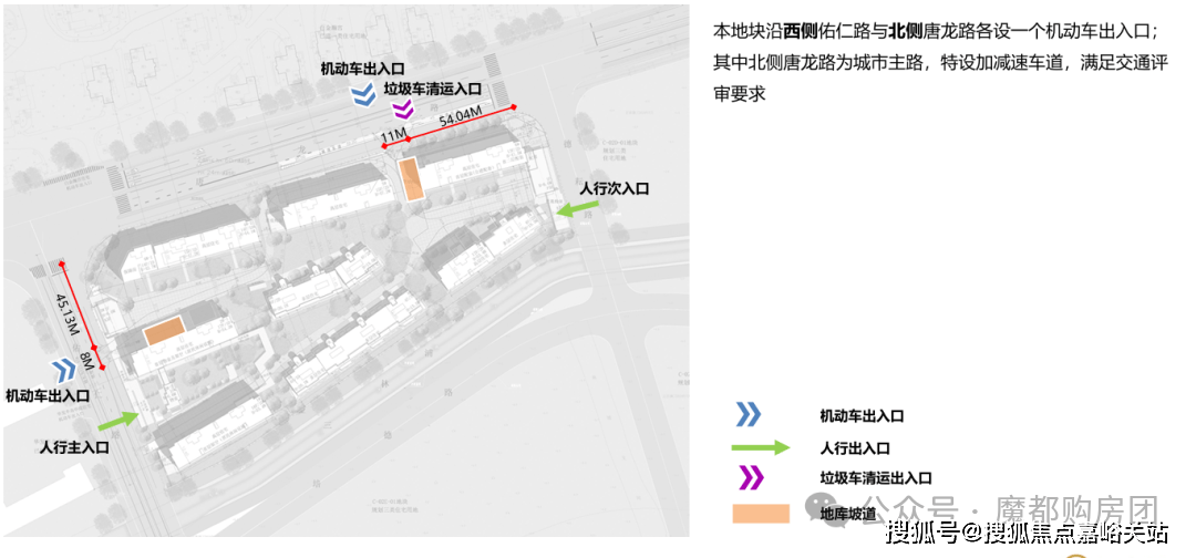小区采用全人车分流设计,主入口位于西侧佑仁路,通行便捷有序。大门庄重大气,门头通过横向感拉槽与奢石景墙巧妙结合,搭配序列感植物,营造秩序感与昭示性。主入口三进式礼序,仪式感与功能性兼备。一进为酒店式落客和车马厅,以礼遇之姿迎接业主归家,大堂尽显尊崇;二进静谧水院、会客廊架、下沉庭院相互呼应,形成意境洄游空间;三进风雨连廊相伴,带来伴水归家惬意体验。次入口在东侧,方便出行。