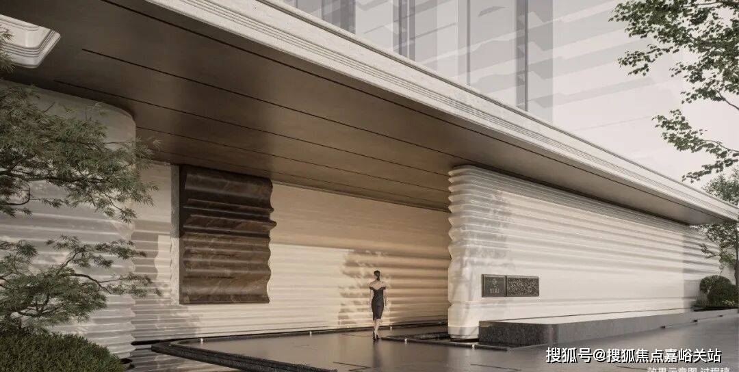材质:局部温润石材、仿铜铝板、仿石铝板及局部仿石涂料,竖向铝板提升品质感