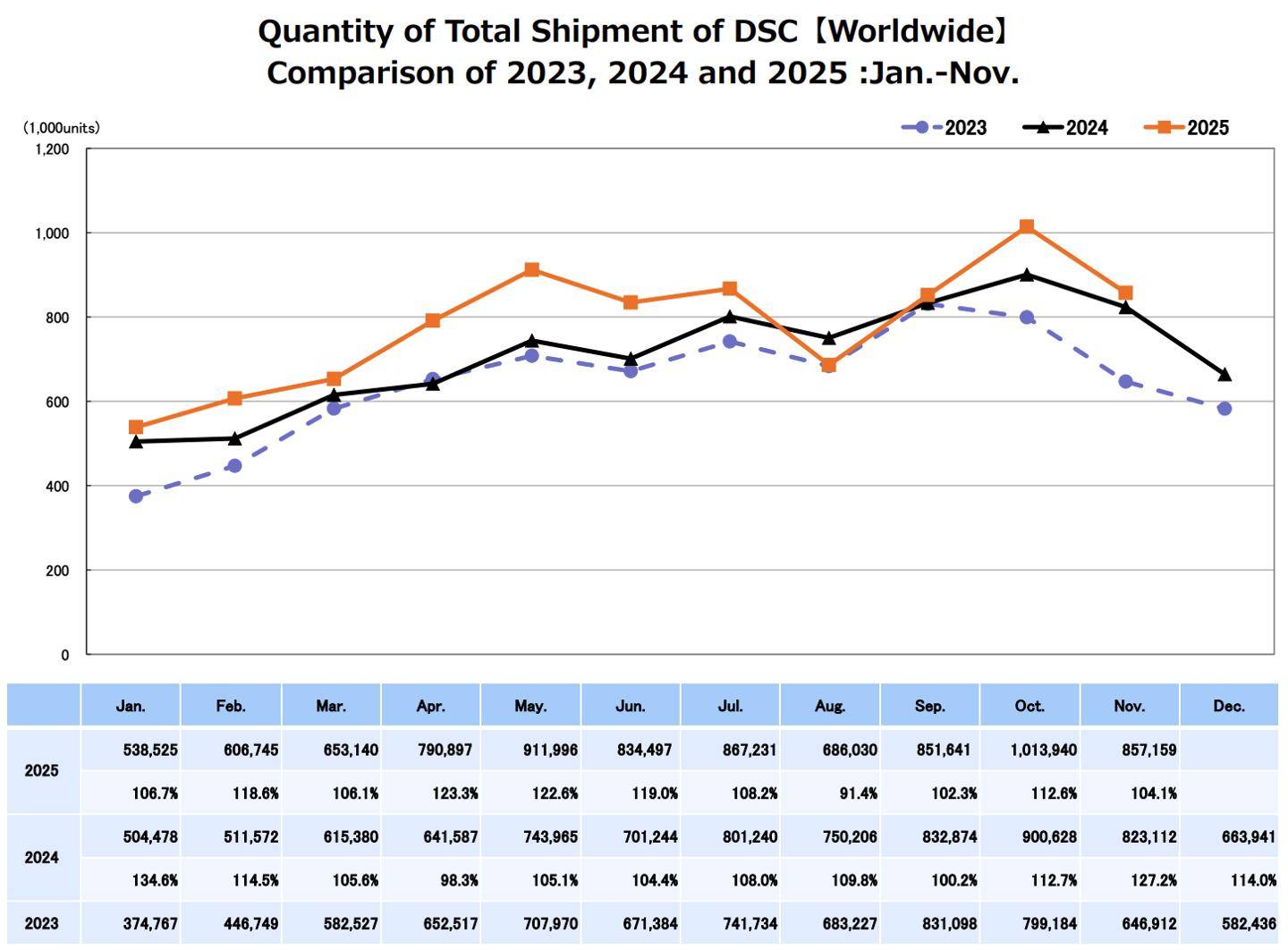 一、2025 年全年出货量:产品种类预测 2025 年出货量2025 年实际出货量可更换镜头相机(ILC)666 万台700.2 万台紧凑型相机192 万台244 万台镜头1056 万支1060 万支二、各类产品细分数据:产品种类出货量同比 2024 年出货金额同比 2024 年数码单反相机(DSLR)下降 31%下降 36%无反相机增长 12%增长 3%紧凑型相机增长 30%增长 49%小于 35mm(全画幅以下)的镜头增长 8%增长 19%35mm(全画幅)及以上镜头下降 2%下降 5%