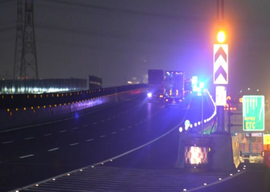 智能抗雾:大治河桥两侧,接入130盏红黄智能诱导雾灯。该系统创新接入实时气象监测数据,与路段气象站联动。一旦检测到团雾、暴雨等恶劣天气,立即自动切换至高频爆闪模式,通过穿透力强的红黄光色变化,在低能见度环境中构建醒目的“光廊”,显著增强车道保持能力与跟车距离判断,实现从“被动反光”到“主动预警”的根本转变。